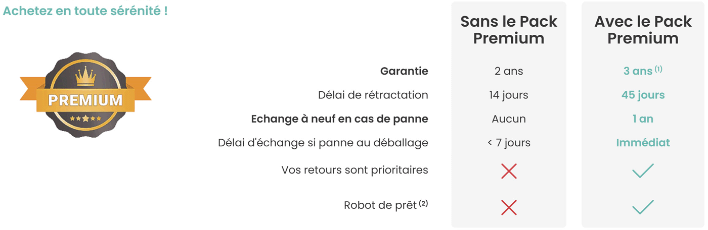 Le Pack Premium étend la garantie commerciale des produits neufs éligibles de 1 an. Les conditions d'application de cette garantie étendue restent les mêmes que la garantie commerciale d'origine. Les produits de votre panier bénéficiant de cette extension de garantie sont mentionnés sur l'encart du Pack Premium après avoir cliqué sur le bouton « En Savoir Plus ».